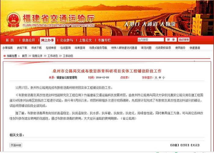 1.泉州市公路局完成布敦巖瀝青科研項(xiàng)目實(shí)體工程鋪設(shè)階段工作